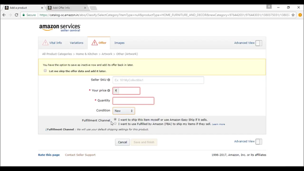 Step 4: Fill the required columns (Seller SKU, Price, Quantity, Condition,Fulfilment channel) and click on save and finish and your offer in the listing will be live within 15 minutes