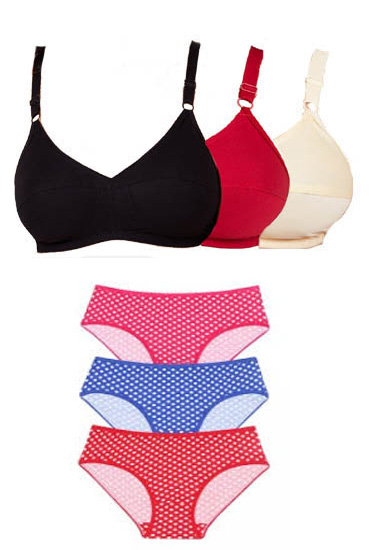 3 Cotton Stretch Everyday Bra Free Mix N Match Panties which is exclusively paired for you. Made of cotton stretch, this bra is extremely comfortable to wear. This breathable fabric is ideal for Indian conditions. It makes you feel comfortable as you lead a modern lifestyle. This bra will enhance your bust size and will provide that perfect shape. This medium coverage daily wear cotton bra is ideal lingerie to keep you at ease for longer duration. Elasticized under band and edges ensure superior support and fit. Adjustable straps with sliders to adjust. Get 3 matching panties with these bras. These bras and free panties are available in 3 different colors so you can wear them with your outfit of choice.- Cotton bras provide a smooth shape and superior comfort