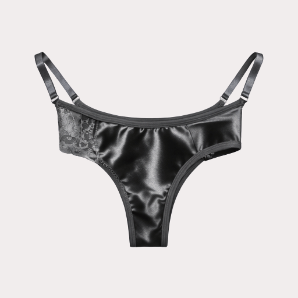Elegant black satin thong panty featuring delicate lace side panels and adjustable straps for a stylish and comfortable fit.
