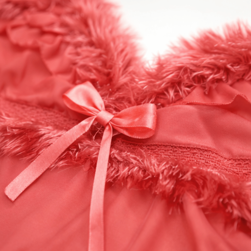 A soft and romantic sheer lingerie set in coral blush, featuring delicate feather trims and satin bows for a dreamy, feminine look.