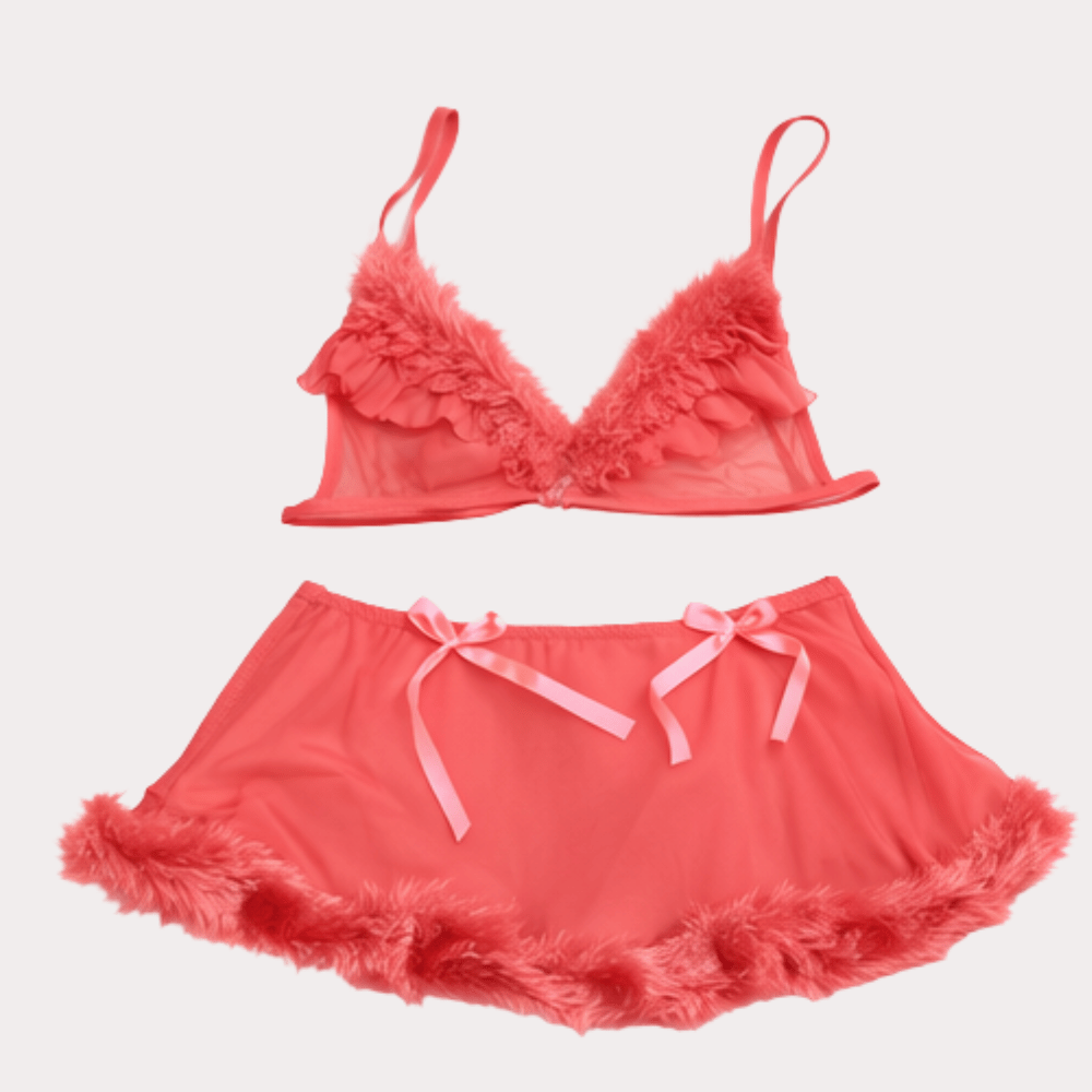 Coral Blush Feather Trim Sheer Lingerie Set with Skirt