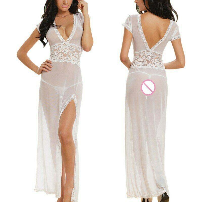 Deep V Neck Side Slit Cut See Through Nightwear