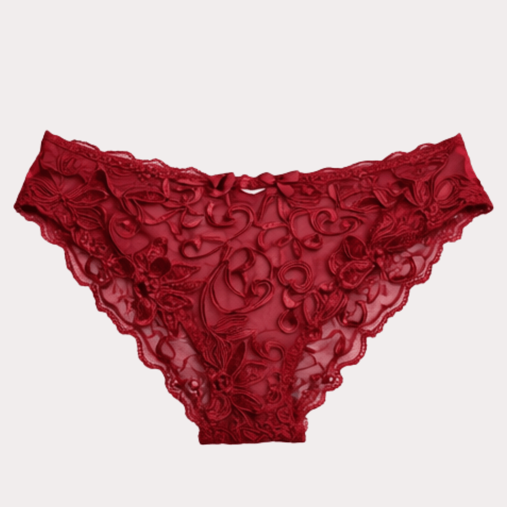 Luxury crimson lace panty featuring intricate floral embroidery, scalloped lace edges, and a delicate satin bow for an elegant feminine look.