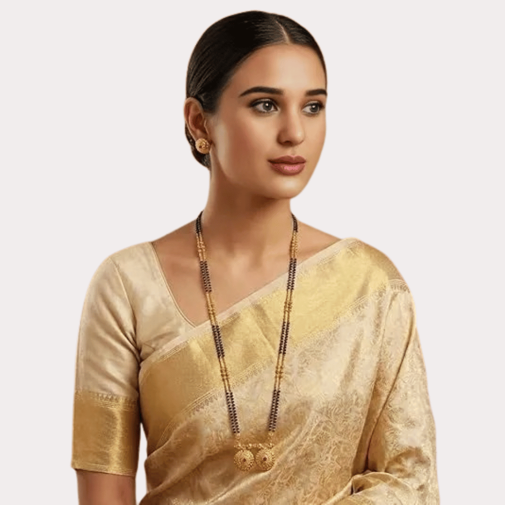 A timeless blend of tradition and elegance, this gold-toned mangalsutra features a double-layer black bead chain with a beautifully crafted pendant—perfect for everyday grace or festive charm.