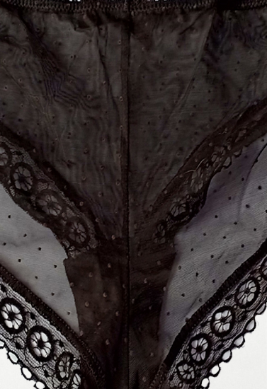 The Elegant Ultra Thin Black Sheer Mesh Lace Panty + 1 Free Bra has the perfect balance of feminine beauty and practical design. The lovely black sheer lace hipster shorty adds a dose of lace to your day. The comfortable panty has a low-rise cut with moderate bottom coverage. The back panel is seamless for a smooth look under your clothes. The floral lace front panel is backed with nude mesh that is soft to the touch. Scalloped elastic trim finishes off the look. Pair the Elegant Ultra Thin Black Sheer Mesh Lace Panty with the matching lace bra for a set of beautiful basics you'll want to wear everyday. The black sheer lace hipster is great for those days when you're feeling extra girly!- Made by polyamide and elastane material