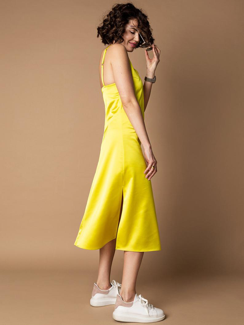 ✓SKU: SDFD93T ✓Fabric: JAPANESE SATIN ✓Size:S,M,L,XL ✓Color: Yellow ✓Seams: Double seaming ✓Style:Slip Dress