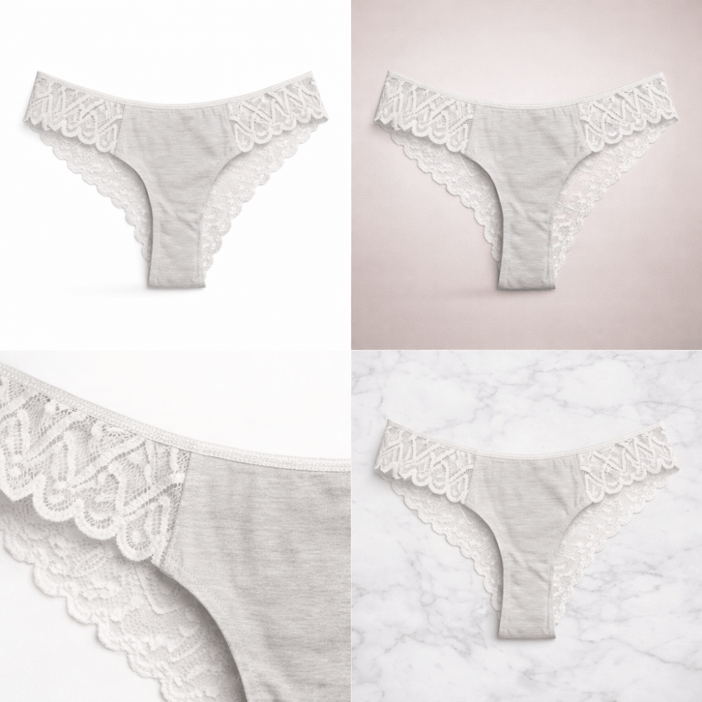 Elegant ivory grey cotton panty featuring delicate lace side panels and soft breathable fabric for comfortable everyday wear.