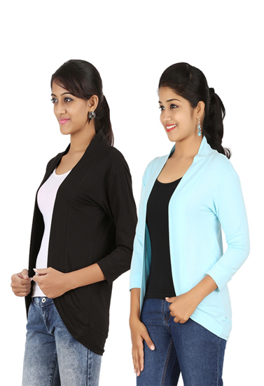 Cover up your problem areas while looking chic and feeling comfortable with this Pack Of 2- Black And Aqua Blue 3/4 Sleeves Shrug made of premium stretchy polyamide fabric.Whether it be for casual, office, or dressy, this super versatile piece can complete any outfit. Both gives you an attractive look, the simple plain shrug is very cool to look and you can wear this with any outfit, it gives you stunning look. This front open style shrug has a relaxed silhouette with an easy fit. It is also lightweight. What's more, it has fitted & slim 3/4 sleeves for that added warmth.Features Of  Pack Of 2- Black And Aqua Blue 3/4 Sleeves Shrug