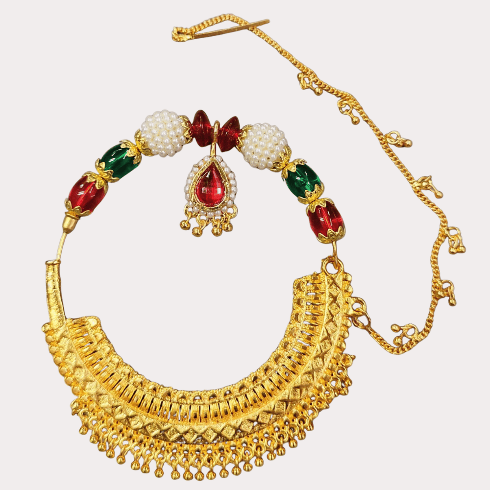 Elevate your bridal look with this exquisitely designed royal nath, crafted to reflect timeless Indian tradition. Featuring a bold gold-tone base with intricate detailing, this piece is beautifully adorned with lustrous pearl beads and vibrant red and green stones for a rich, festive appeal.