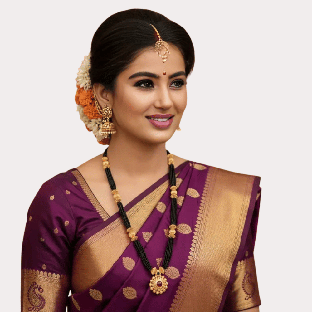 Add a touch of royal elegance to your jewelry collection with this exquisite multi-strand mangalsutra. Designed with multiple layers of traditional black beads, it is enhanced with intricate gold-toned accents that create a rich and luxurious appeal.