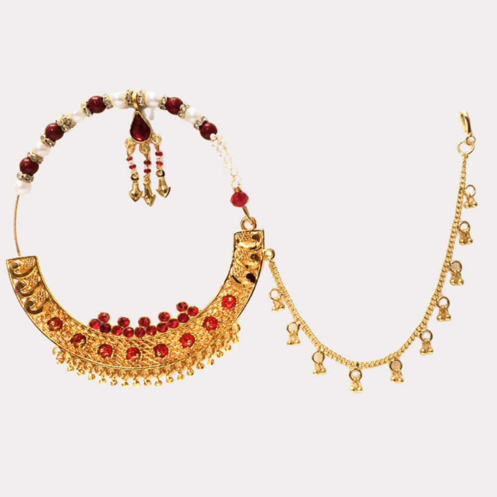 Elegant gold-toned bridal nath featuring red stone embellishments, pearl accents, and a delicate chain—perfect for weddings and festive wear.