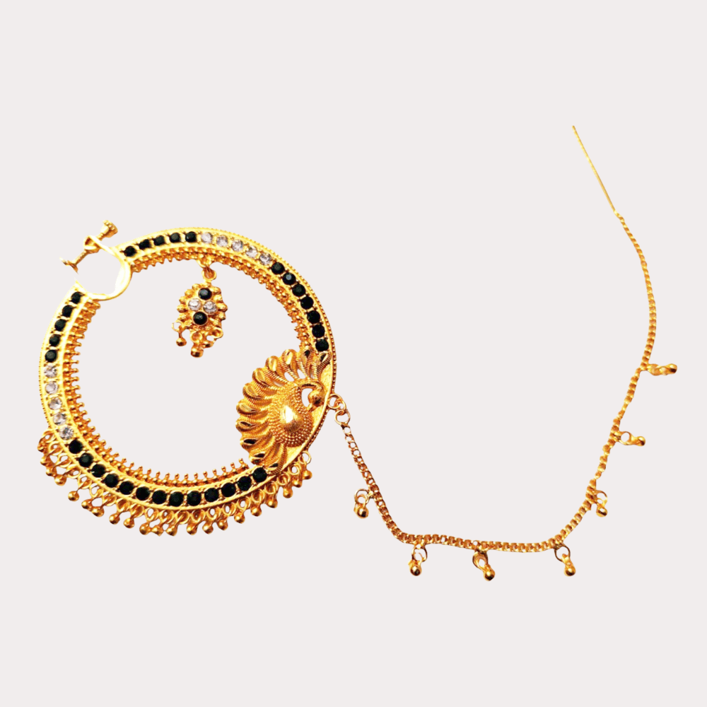 Royal Sun Motif Bridal Nath with Chain – Gold-Toned Black Stone Traditional Nose Ring
