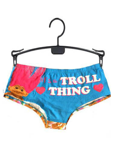 You’ll love the sexy feeling you get when you pull on Troll Thing Printed Hipster Panty. The cotton and elastane material feels great on your skin and helps prevent chaffing caused by abrasive fabrics. The hipster cut provides you with simple style and comfort along with cute details like a plush waistband and covered leg elastic. The soft material lays flush against your skin so that they go undetected in fitted jeans and skirts. It provide moderate coverage and are available in blue pink mix color. Moreover, the cute cartoon printed in back portion looks very sexy and smart.Features
