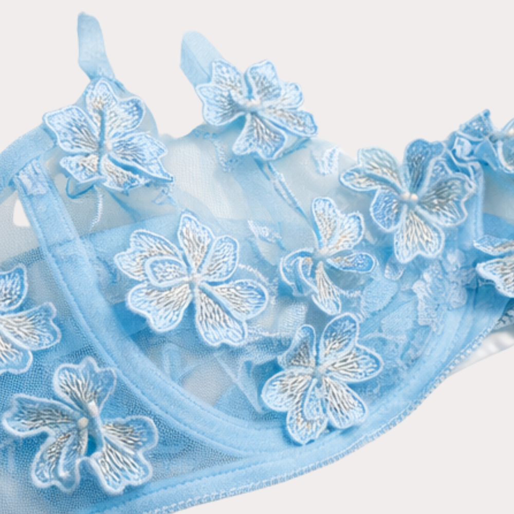 Delicate sky blue sheer mesh bikini top with floral embroidery and underwired support — perfect for elegant beach and resort styling.