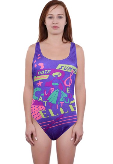 Get swimwear that's fun and flattering with this Summer Note Printed Violet Bathing Swimsuit. Made with a polyamide and elastane blend ,this product is a smart addition to your swimming wardrobe. This word printed-style swim suit is a complete bathing ensemble. With an elasticized fit on the waist, you can move comfortably and without self-consciousness. The scoop neckline and plain style straps provide this swimsuit's characteristic feminine silhouette. The word printed style looks awesome and has full coverage in the back. This product is fashionable and attractive and will add a nice retro touch to your beach or pool outing.Wash Care Instructions