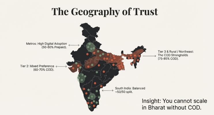 | Tier 3 & Rural India | 75–85% | 15–25% | COD dominant |