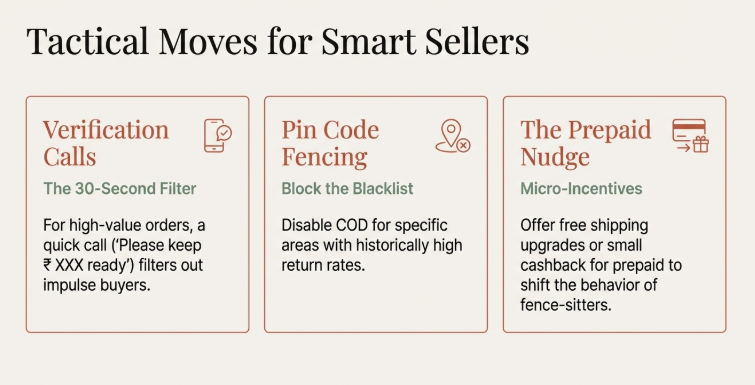 Not all pin codes are equal. Some areas have historically high COD refusal rates. Smart sellers either disable COD for those pin codes or add a small COD handling fee to make fulfillment financially viable.
