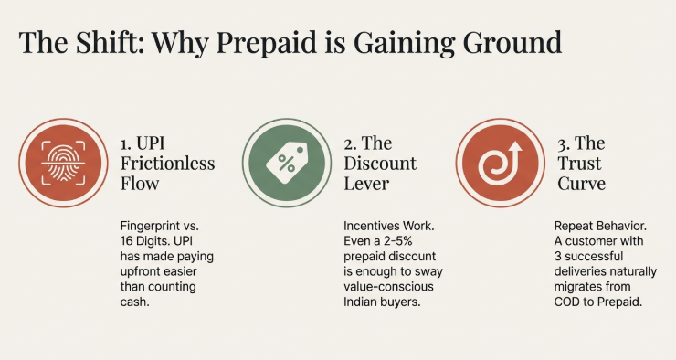 Before UPI, paying online meant entering 16-digit card numbers and OTPs. Today, it is a 4-digit PIN or a fingerprint. That simplicity has converted millions of COD buyers into prepaid buyers.