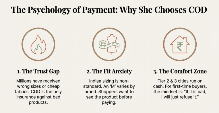 Cash on Delivery is not just a payment option in India. It is a cultural preference, a trust mechanism, and for millions of women shopping fashion online for the first time — it is the only way they feel safe buying.
