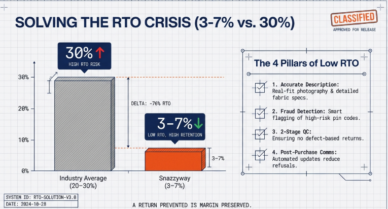 The industry average RTO for fashion in India is 20–30%. Snazzyway runs at 3–7%. Here is how: