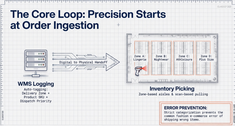 Our warehouse team in Uttarakhand works in organized aisles divided by product category — lingerie, nightwear, loungewear, athleisure, and plus size. Each picker is assigned a zone and uses a scan-based system to ensure the right product is pulled every time. This dramatically reduces wrong item shipments, which is one of the biggest reasons for returns in fashion ecommerce.