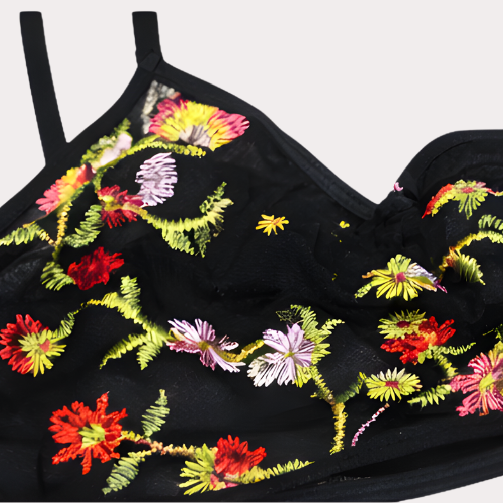 The intricate floral detailing against the classic black base creates a statement look that pairs beautifully with matching or solid bikini bottoms.
