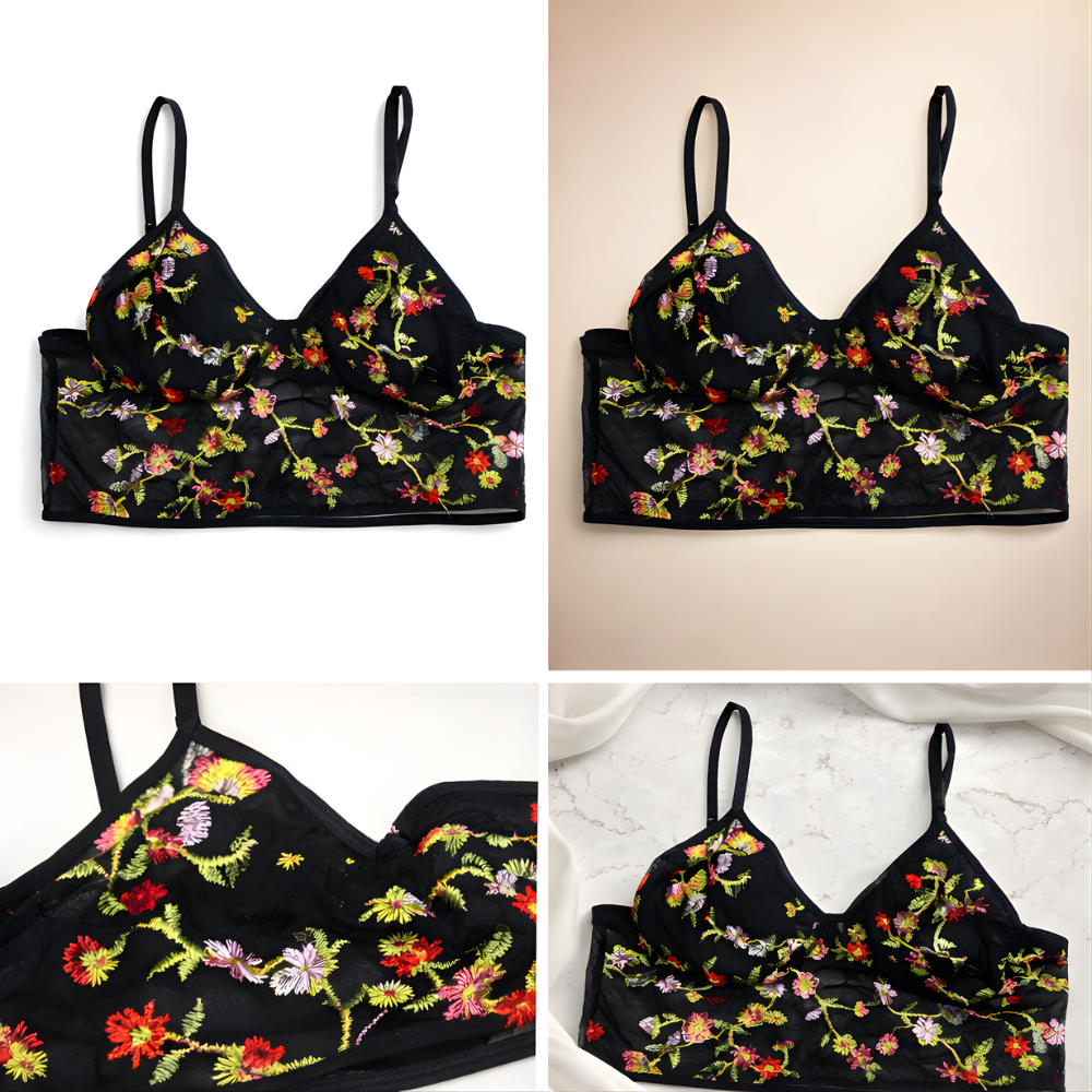 Elevate your swimwear collection with this elegant black floral bikini top designed for a bold yet feminine beach look. Featuring delicate multicolor floral prints on a sheer mesh base, this swimwear top blends sophistication with modern style.