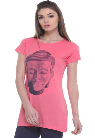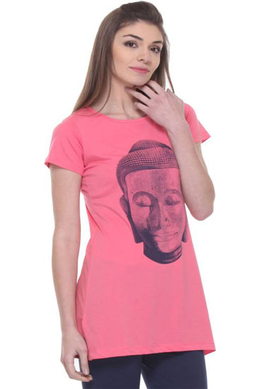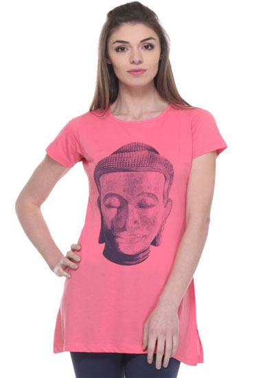 Add a new T-shirt with a funky twist to your wardrobe with the Buddha Printed Pink Comfy Tunic. This round-neck tee includes a round neck with delicate details sewn across. The long hem of this tunic falls at thigh-length with slits on the sides to help the hem flow with you as you walk. The soft fabric of this short-sleeve tee is no show decoration and looks amazing stylish. A decent buddha print adds to the casual look of this tunic. Pair with your favorite skinny jeans or leggings for a comfortable day out. This beautiful creation will give you a trendy look when clubbed with matching leggings and sandals.- Made by cotton material