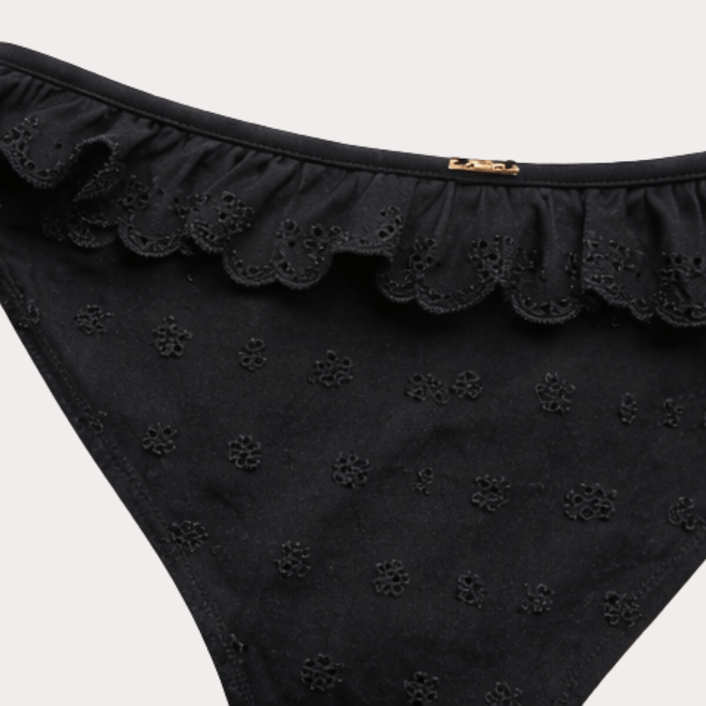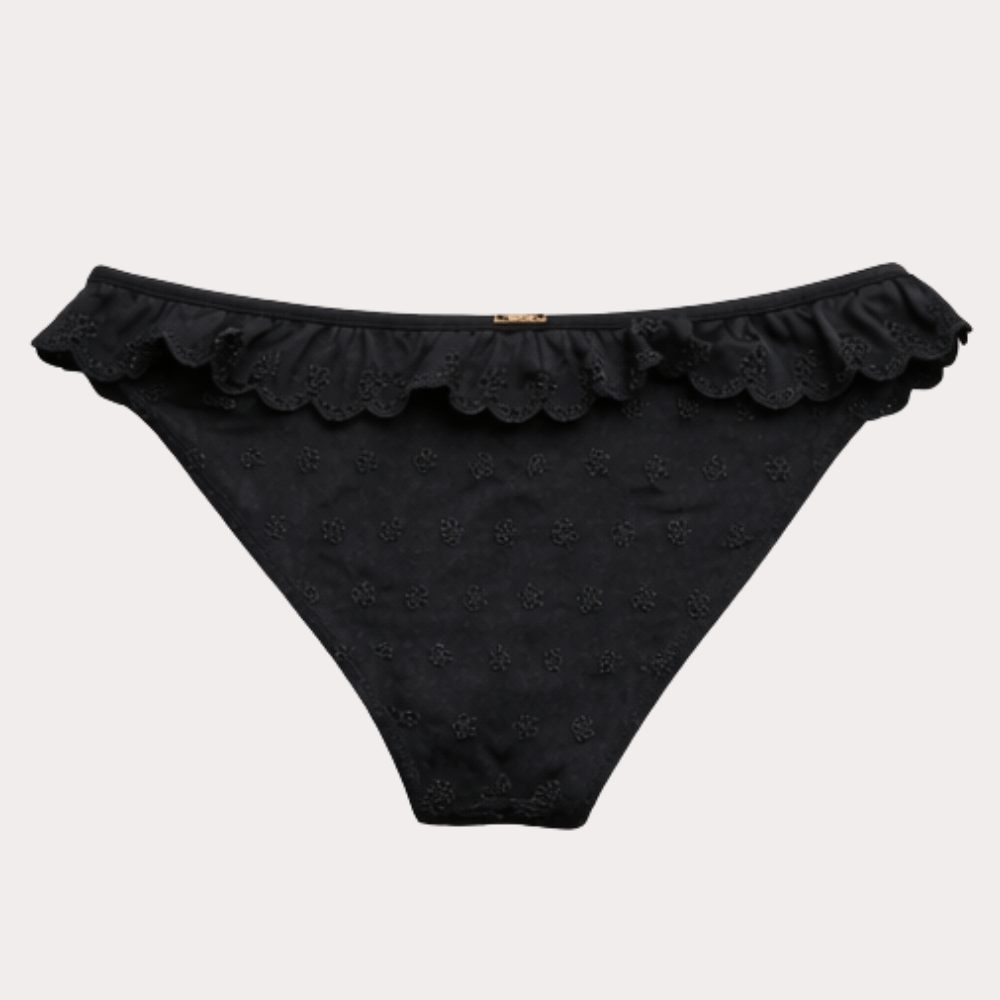 Soft black cotton panty with delicate embroidery and frill lace waistband, offering comfort with an elegant feminine touch.