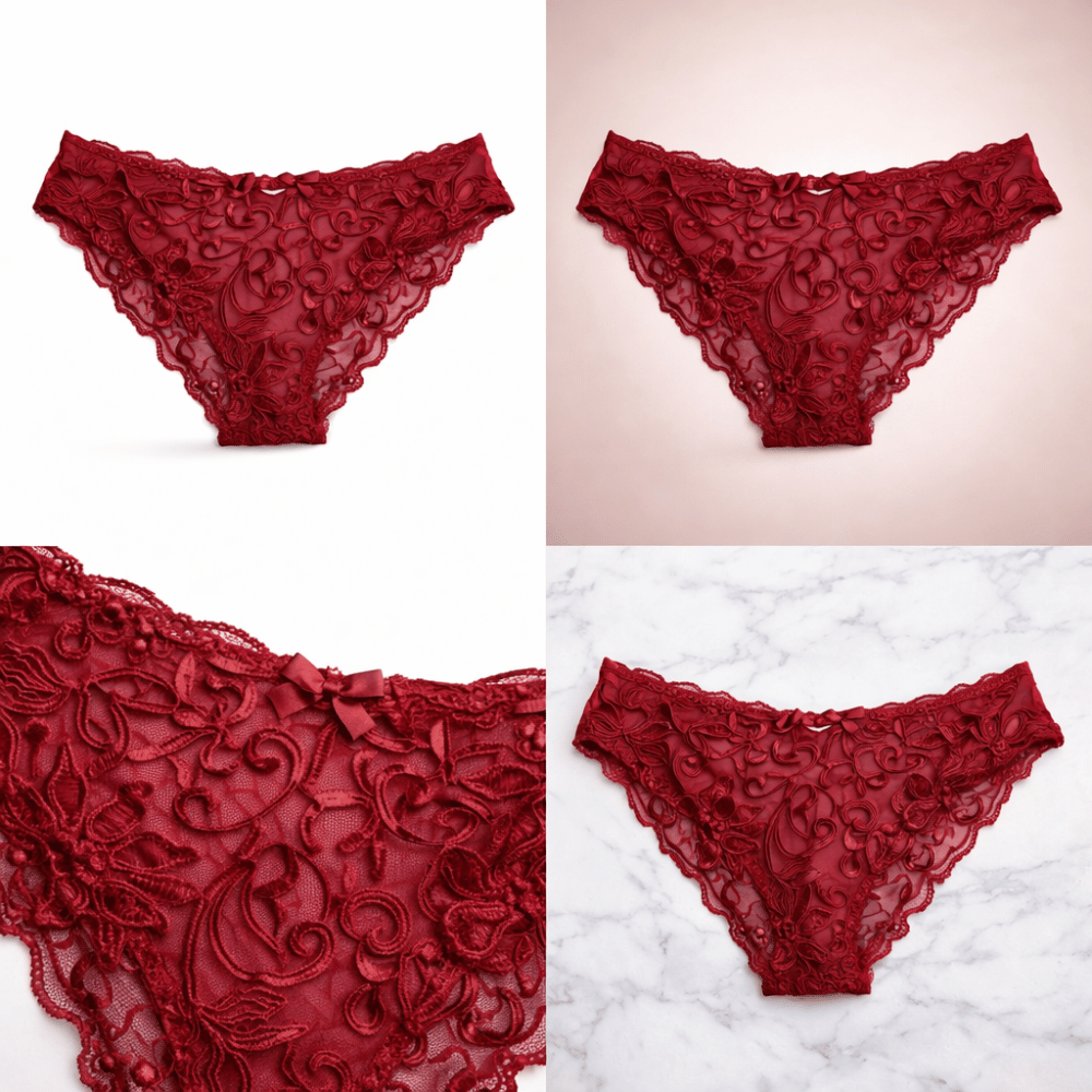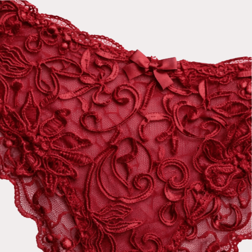 Luxury crimson lace panty featuring intricate floral embroidery, scalloped lace edges, and a delicate satin bow for an elegant feminine look.