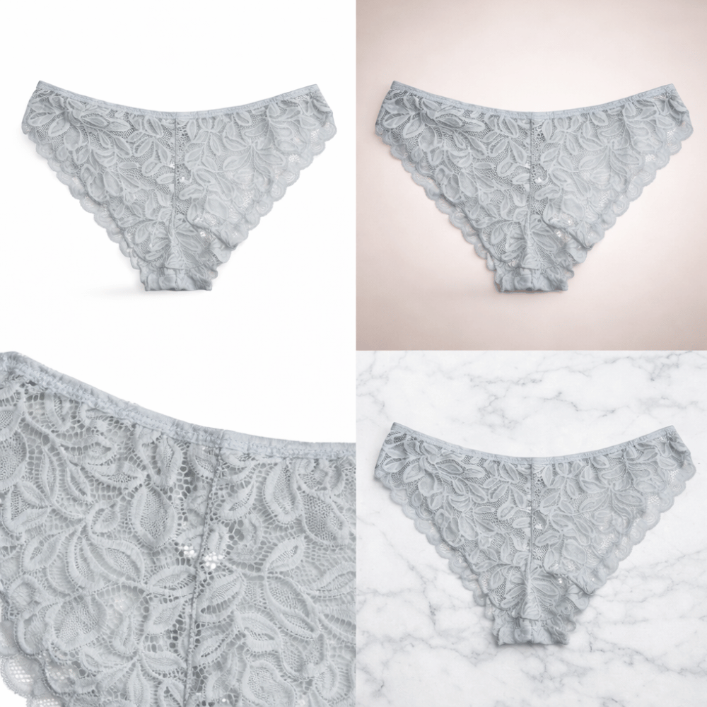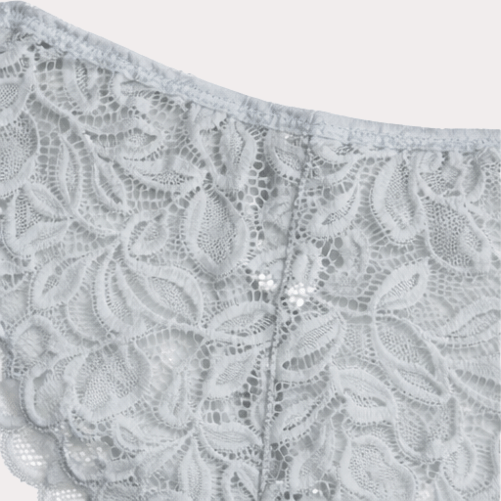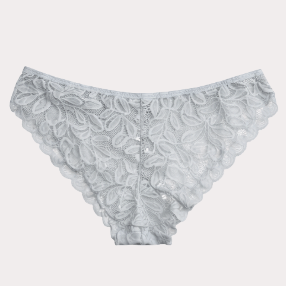 Elegant silver grey lace panty featuring delicate floral lace fabric, scalloped edges, and a comfortable lightweight fit.