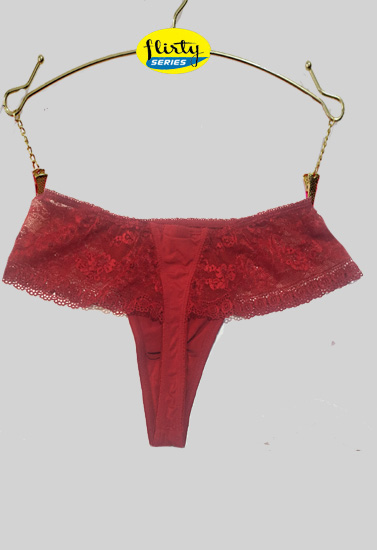The Essentiel Maroon Lace Skirt Thong offers all day comfort. The outer layer consists of just the right blend with added elastane to provide you with a soft and secure fit. These thongs blend right into your fashionable wardrobe, so there is no panty line. Made of a lightweight polyamide and elastane lining to help prevent the underwear from shrinking in the wash, the underwear will last. The lace thong is free of any decoration and is highly breathable so you'll stay cool on hot days. Featuring material covering the elastic, it prevents irritation around the waist and thigh area. Lace cut details attracts you lot. The thong also comes without a tag to avoid discomfort in the back area.Important Features to Buy