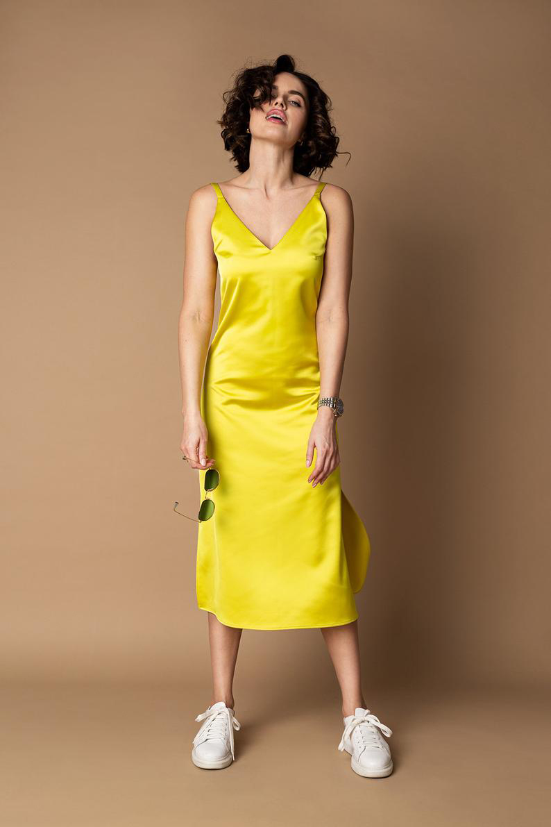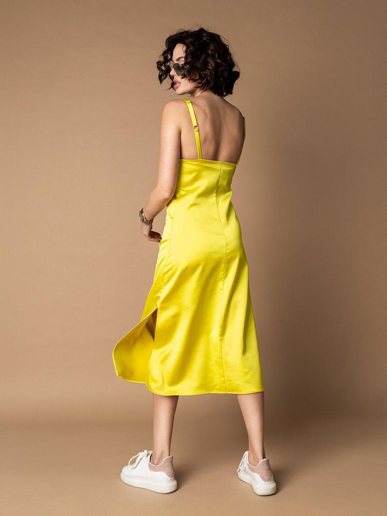 ✓SKU: SDFD93T ✓Fabric: JAPANESE SATIN ✓Size:S,M,L,XL ✓Color: Yellow ✓Seams: Double seaming ✓Style:Slip Dress