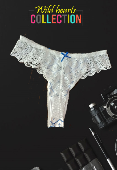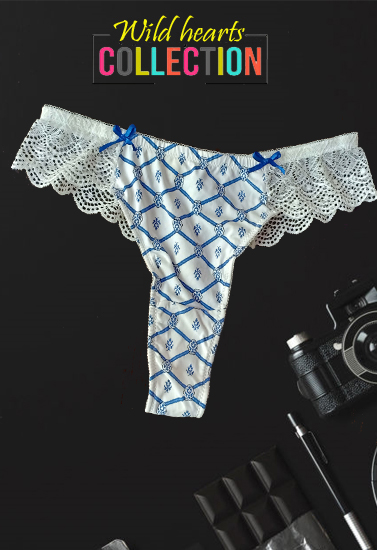 ✓Brand: Imported ✓SKU: FTW@BLT09 ✓Color: White & Blue ✓Brief Size: M ✓Material: 90% Polyamide & 10% Elastane ✓Features: Minimal Lace Back Coverage, Elastic Waistband With Attached 2 satin Peplum, Printed Details ✓Pattern: Lace Thong
