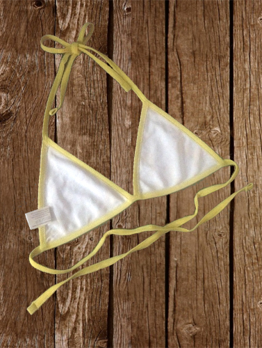 Cute Kiabi Yellow Flower Print Triangle Halter Bikini Top just for your little girl. The bikini top comes with a triangle top with halter strap for a trendy vibe in pretty yellow color. Finished in a comfortable way, so seams don't bother the kids. Take your child to the pool or the beach with this bikini top. It is made for small children and features a tie back for easy use. This girls' bikini is ideal for summer weather. Pack one for you child when planning a family vacation or weekend swimming trip. It is easy to put on or take off.- Made for children