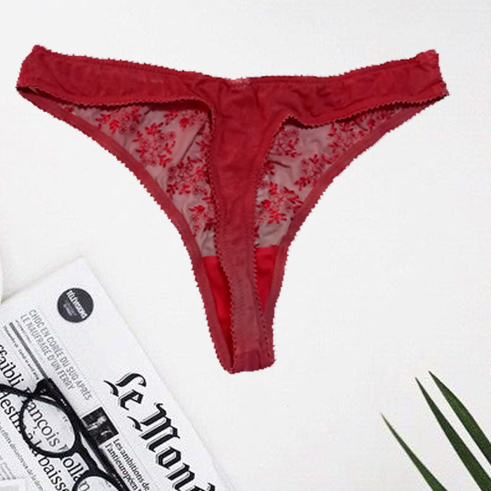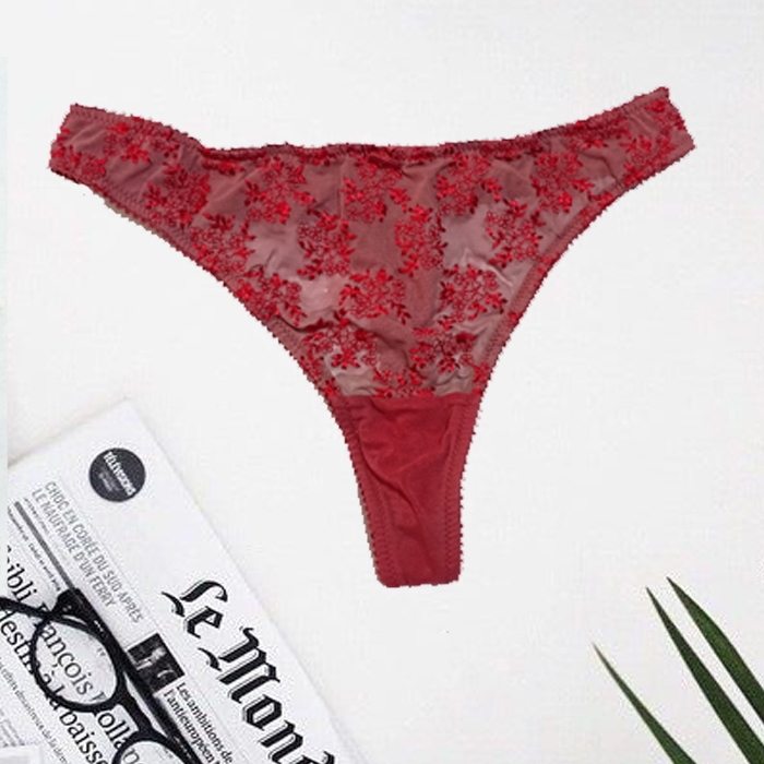 This Ladies Flirty Thread Lace Maroon Thong is a must have. The polyester blend feels great on your bottom and helps prevent chaffing. The soft silky material lays flush against your skin so that they go undetected in fitted jeans and skirts.- Made by polyester material