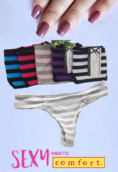 The secret in these Peanuts Striped Print Thong Panties Pk-5 is the impeccable cut and 100% cotton fabric. The cotton feels great on your bottom and helps prevent chaffing. The thong cut sits right on your waistline with a covered elastic band for added comfort. The soft material lays flush against your skin so that they go undetected in fitted jeans and skirts. Feel free to wear what you want and feel confident doing it. This value pack includes 5 different colors for you to choose from every day of the week. Available in sizes S, M, L.- 100% Cotton fabric