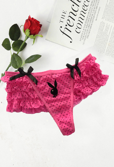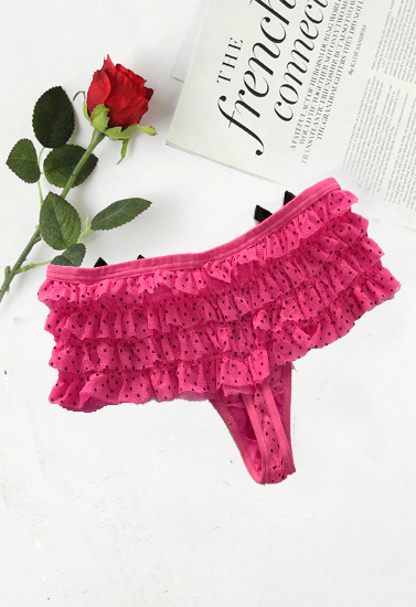 The Pink Mesh With Black Bows Frilly Skirt Thong comes in great color and smooth lace. You'll love this frill lace thong. This Pink Mesh With Black Bows Frilly Skirt Thong is made out of stretch lace and mesh, featuring sexy minimal back coverage. The frill thong panty design is similar to a thong, sitting low on your waist but not leaving you totally exposed. This panty is extremely low-rise, for a sexy, modern look. It feels great against your skin, no matter what you're doing.Important Features