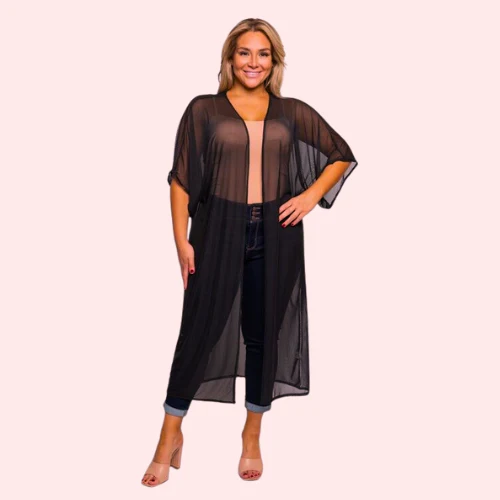 The Plus Size 5XL-6XL See-Through Black Robe, designed to make you feel elegant and comfortable. Made from soft, breathable mesh fabric, it drapes beautifully over your curves. The robe has an open front, perfect for showing off your favorite lingerie or wearing alone. A silky satin tie at the waist lets you adjust the fit, highlighting your shape. Lace details on the hem and sleeves add a touch of luxury. The see-through material gives a hint of what’s underneath, making it perfect for special evenings. This robe is made to make fuller figures look and feel great. It’s a must-have for relaxing at home or a romantic night.
