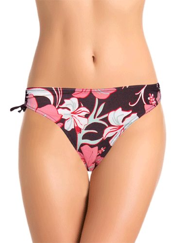Soak up the sunshine in this Rodeo Hibiscus Print Side Tie Bikini Bottom with its hibiscus flower design and dark brown detailing for an effortless beach look. The bikini bottom and thin tie side straps offer minimal coverage that is ideal for long afternoons of sun bathing. Complete the look with the Snazzyway Bustier.