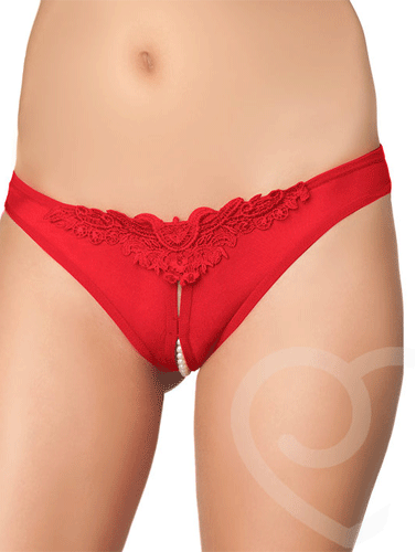 Romantic Red Crotchless Lace Thong With Pearls