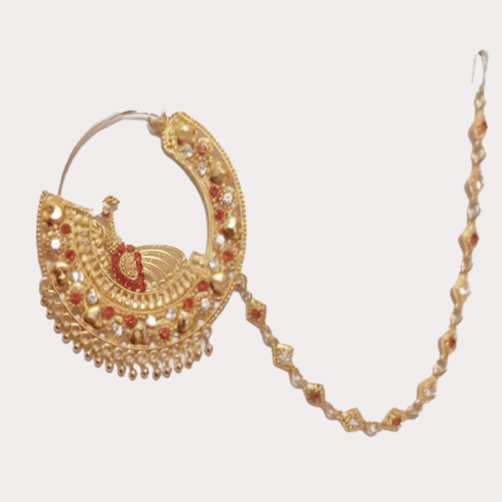The attached chain, designed with subtle decorative elements, ensures a secure fit while adding grace to your overall appearance. Ideal for weddings, bridal ceremonies, and festive celebrations, this nath pairs perfectly with lehengas, sarees, and heavy ethnic outfits.