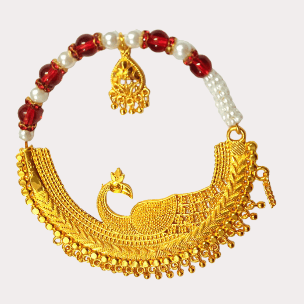 Elegant peacock design bridal nath with red bead accents, gold detailing, and a decorative chain—perfect for weddings and festive wear.