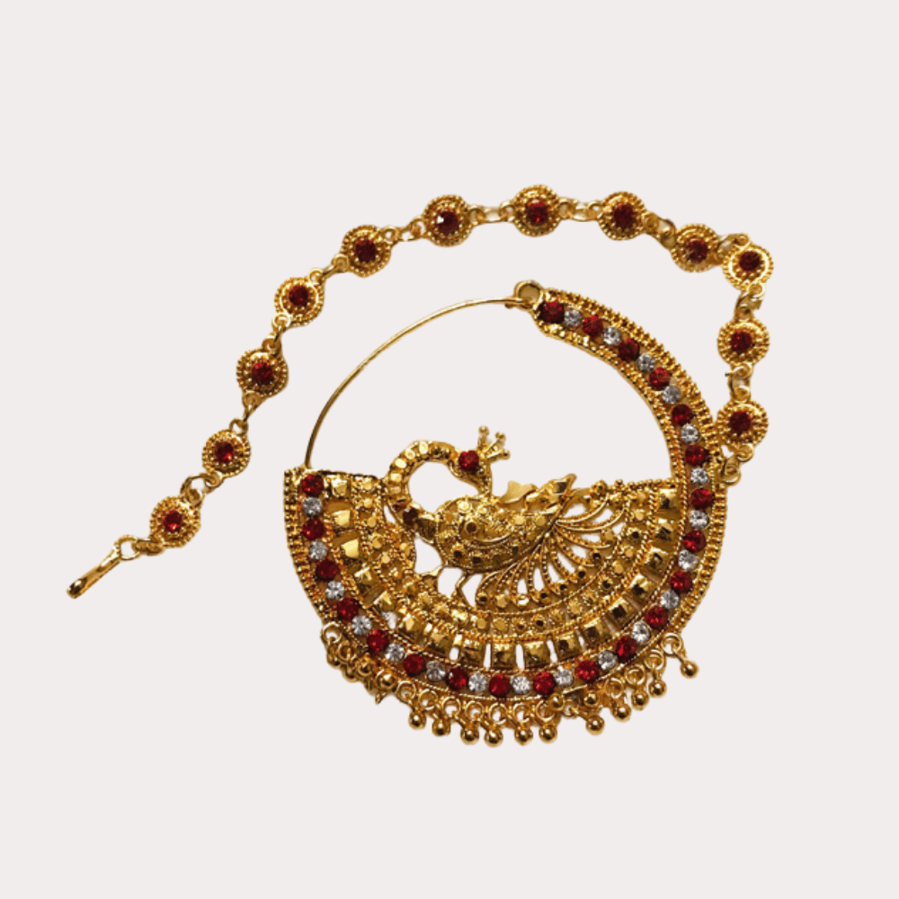 Royal Peacock Design Bridal Nath with Chain – Gold-Toned Red Stone Nose Ring