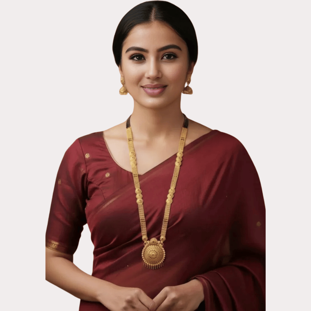 A grand expression of tradition, this temple-style mangalsutra features a long gold-tone chain with an intricately carved antique pendant—perfect for festive and bridal wear.
