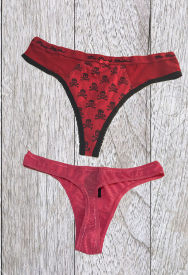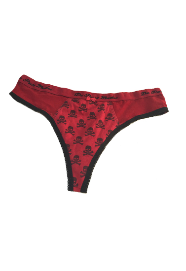 Stay comfortable throughout the day with this red cotton thong. Thong is made of 90% cotton and 10% spandex for a soft and secure fit. This thong panty has skull print and stretchy net at both sides. Elastic on waistband with the print of brand name. The crotch lining is also secured with black elastic. This is highly breathable so you'll stay cool on hot days.