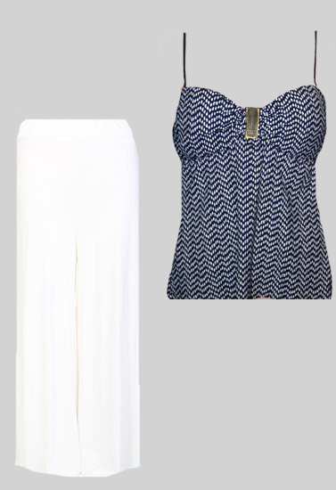 Trendy Zig-Zag Crop Top And White Palazzo Bottom are perfect introduction to your summer wardrobe. These stylish and comfortable palazzo are styled with an extra-wide, ruched waistband. Wide, loose Flare finish these chiffon-stretch pants with a modern fit. This cami features navy print, bandeau design with padded cup and detachable straps. This 72% polyamide with shelf bra also has elastane for a more comfortable fit. The detachable straps offer a more styles such as criss-cross, one shoulder, strapless and more; it also gives personalized fit. Metal at the center with pretty shirring will complement any outer paired with it.Zig-Zag Print Convertible Straps Crop Top