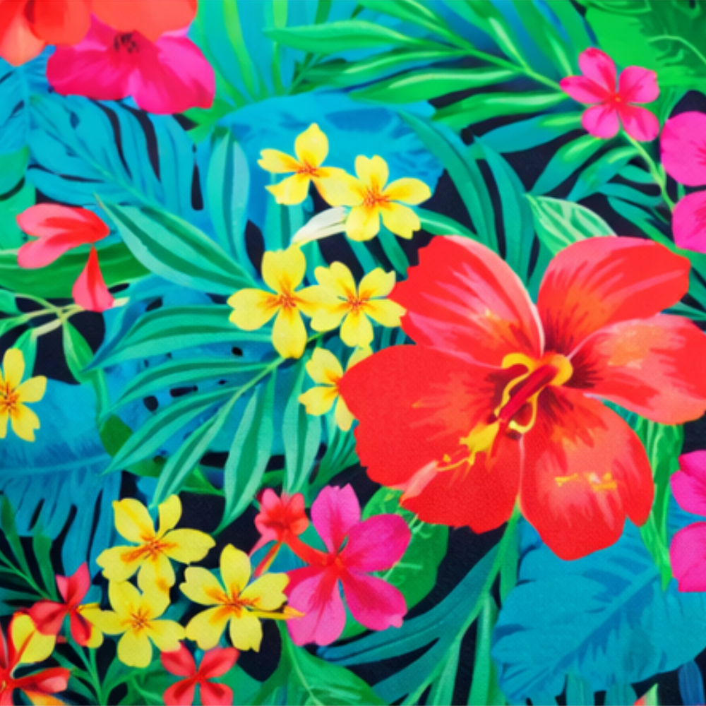 Featuring bold red, pink, and yellow floral prints over lush green tropical leaves, this bikini top is perfect for beach vacations, pool parties, honeymoons, and resort wear styling. The soft, stretchable fabric ensures comfort, while the secure back closure provides stability during swimming or sunbathing.
